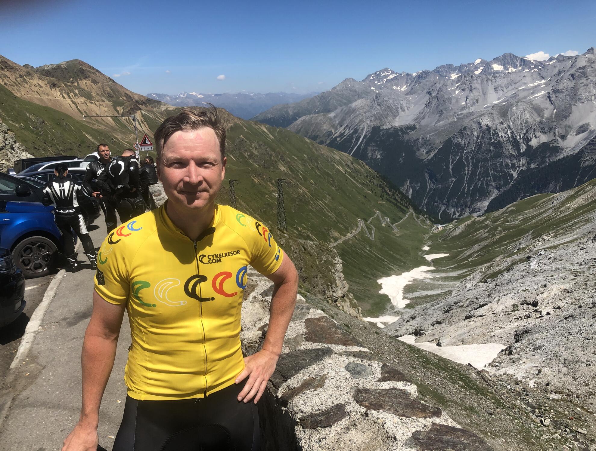 2 760 meter över havet! Efter gofika på toppen rullade vi ned på den västra sidan till vårt boende i världskända skid- och cykelorten Bormio. Härifrån körde vi sedan bl.a. "Kungaetappen" på 11 mil med utmanande och fantastiska Passo Mortirolo och Passo Gavia.
